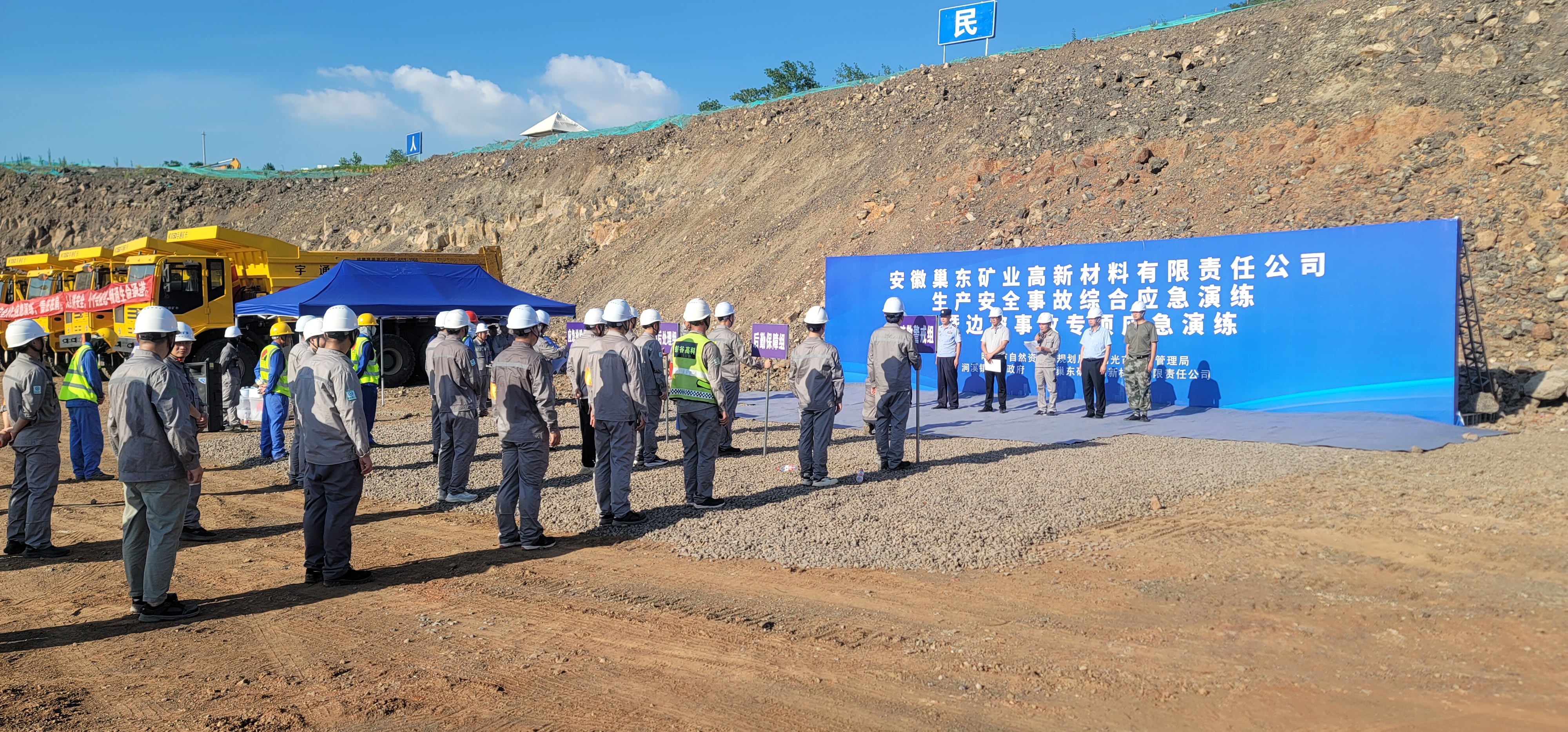 此次演練模擬受連日暴雨,礦區(qū)發(fā)生坍塌致人員受傷、車輛被困的突發(fā)事件,巢東礦業(yè)根據(jù)事故情況立即啟動公司應急預案。演練科目涵蓋信息報送、啟動預案、會商研判、搶險救援、醫(yī)療救護、響應終止等內(nèi)容環(huán)節(jié)。此次演練動用了包括警車、救護車、應急搶險車、渣土運輸車及各型挖掘機在內(nèi)的多種車輛設(shè)備,并使用2臺無人機全方位全過程進行拍攝,參演及觀摩人員達到60余人。現(xiàn)場各任務小組分工明確、密切配合,全面檢驗非煤礦山生產(chǎn)安全事故應急預案的可操作性和實用性,進一步提升了巢東礦業(yè)應對突發(fā)事故的綜合指揮能力、快速反應能力、應急處置能力和協(xié)同救助能力,同時檢驗了巢東礦業(yè)應對異常高溫天氣突發(fā)安全事件的應急水平?,F(xiàn)場演練結(jié)束后,各小組負責人及主要參演人員對本次演練情況進行總結(jié)。