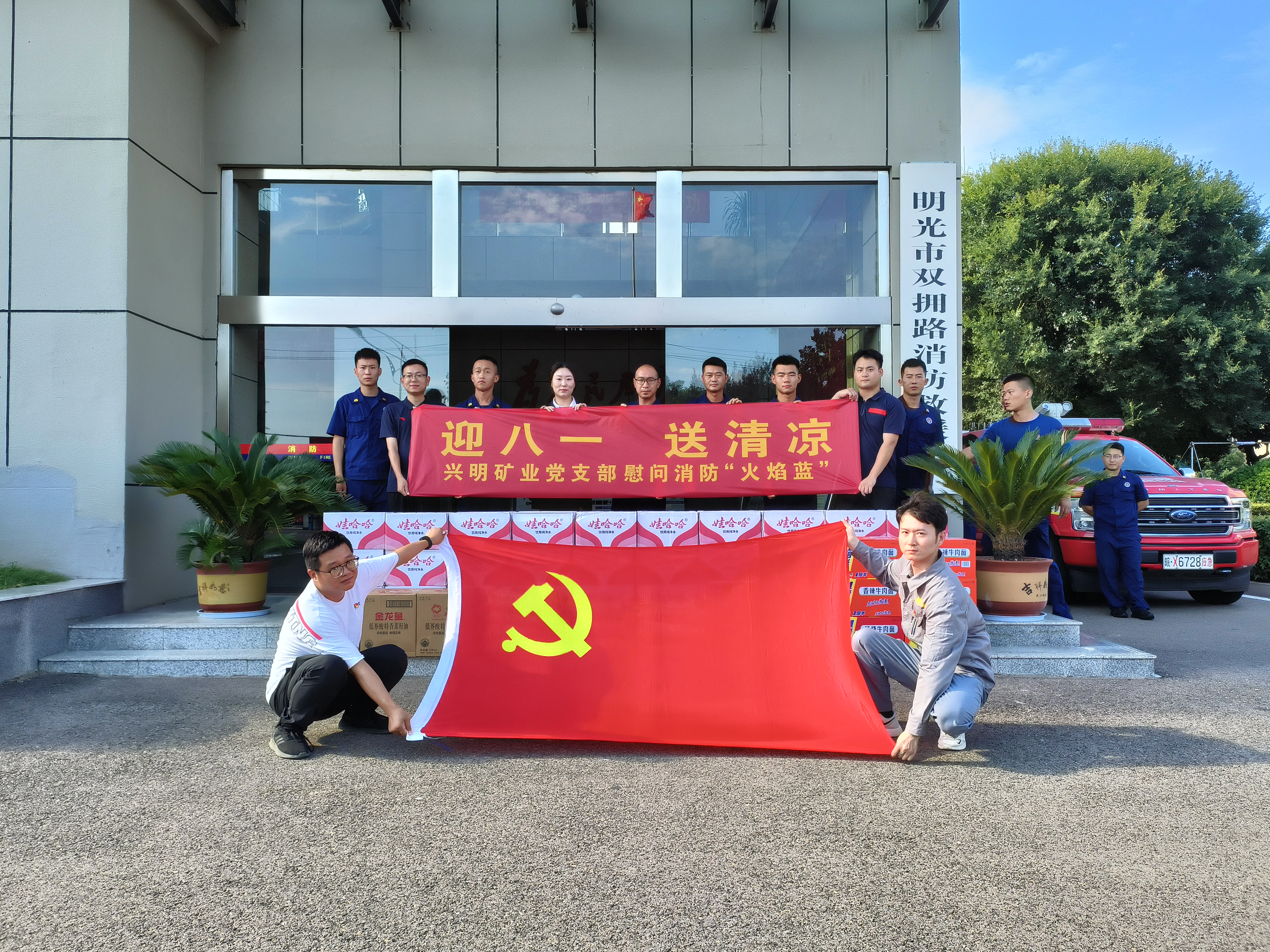 “八一”前夕,興明礦業(yè)黨支部帶著滿(mǎn)滿(mǎn)的關(guān)懷與敬意,走進(jìn)明光市消防救援大隊(duì)開(kāi)展“送清涼”活動(dòng),為消防員們送上了礦泉水、方便面等物資。